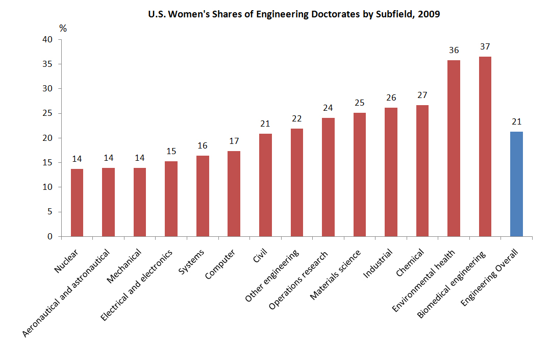 - Representationen av kvinnliga och manliga ingenjörer varierar med forskningsfältet. Inom de biomedicinska och jordbruksrelaterade områdena är andelen kvinnor störst, medan mekaniska och elektriska ingenjörsvetenskaper har störst andel män – se diagrammen för EU och USA (NSF, 2011; EU-EGGE, 2009; Gibbons, 2009; PROMETEA, 2006). För fördelningen av kvinnor och män inom vetenskapliga underdiscipliner och medicinska specialiteter, se ojämlikheter.